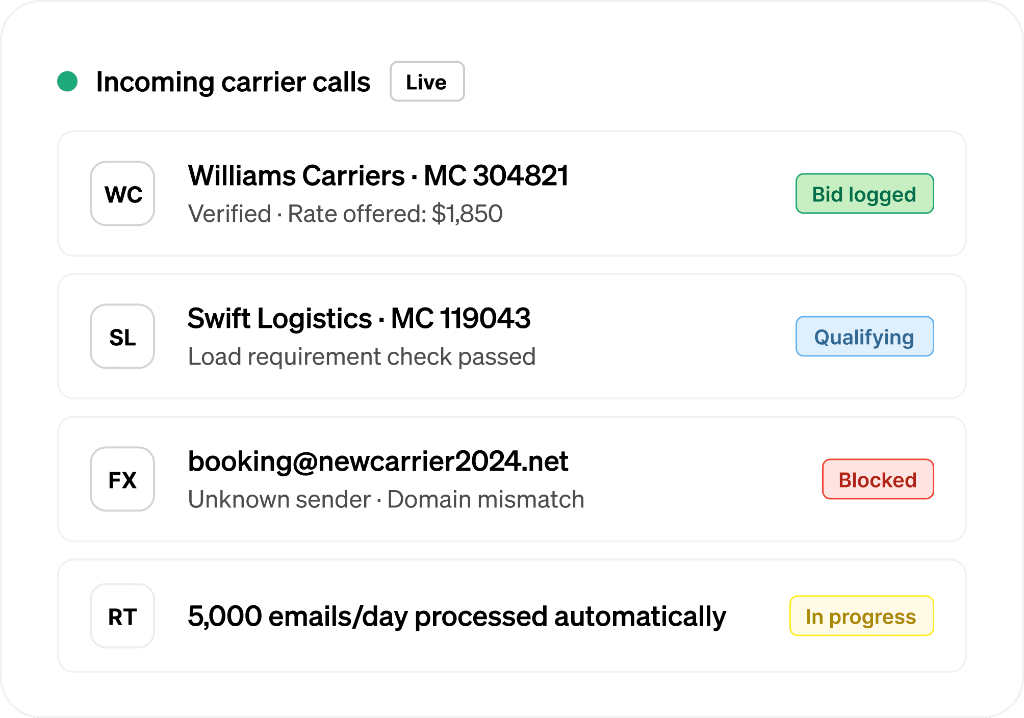Every inbound is checked against Highway fraud signals. Identity spoofing and bad actors are flagged before load details are ever shared.