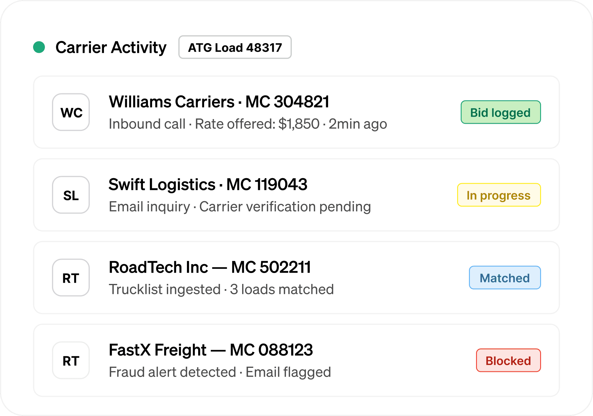 Full visibility into every call, email, and trucklist interaction. Recordings, transcripts, and bid history are captured in one place so nobody has to chase down an update.