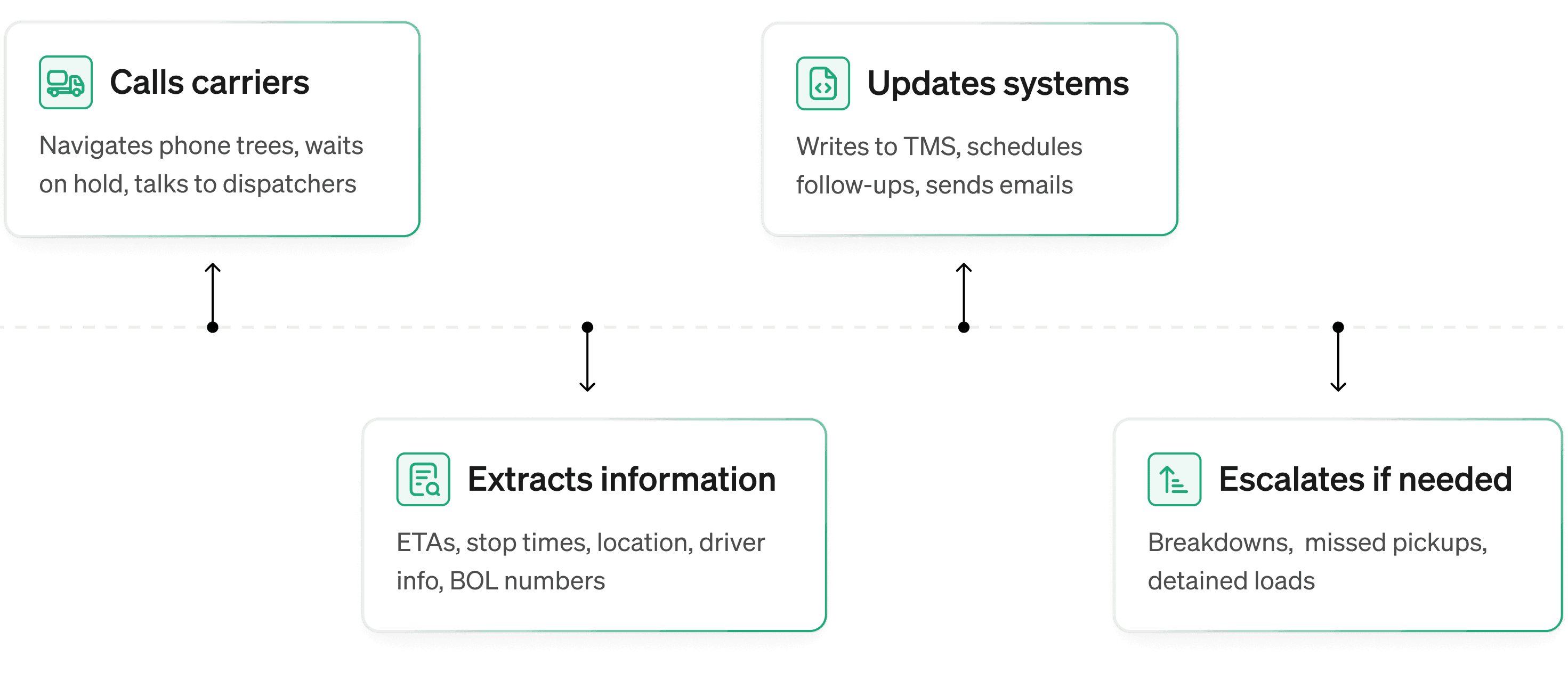 A standard Track & Trace process, now an intelligent, scalable workflow. Augie calls carriers, confirms ETAs, handles breakdowns, and updates TMS automatically.