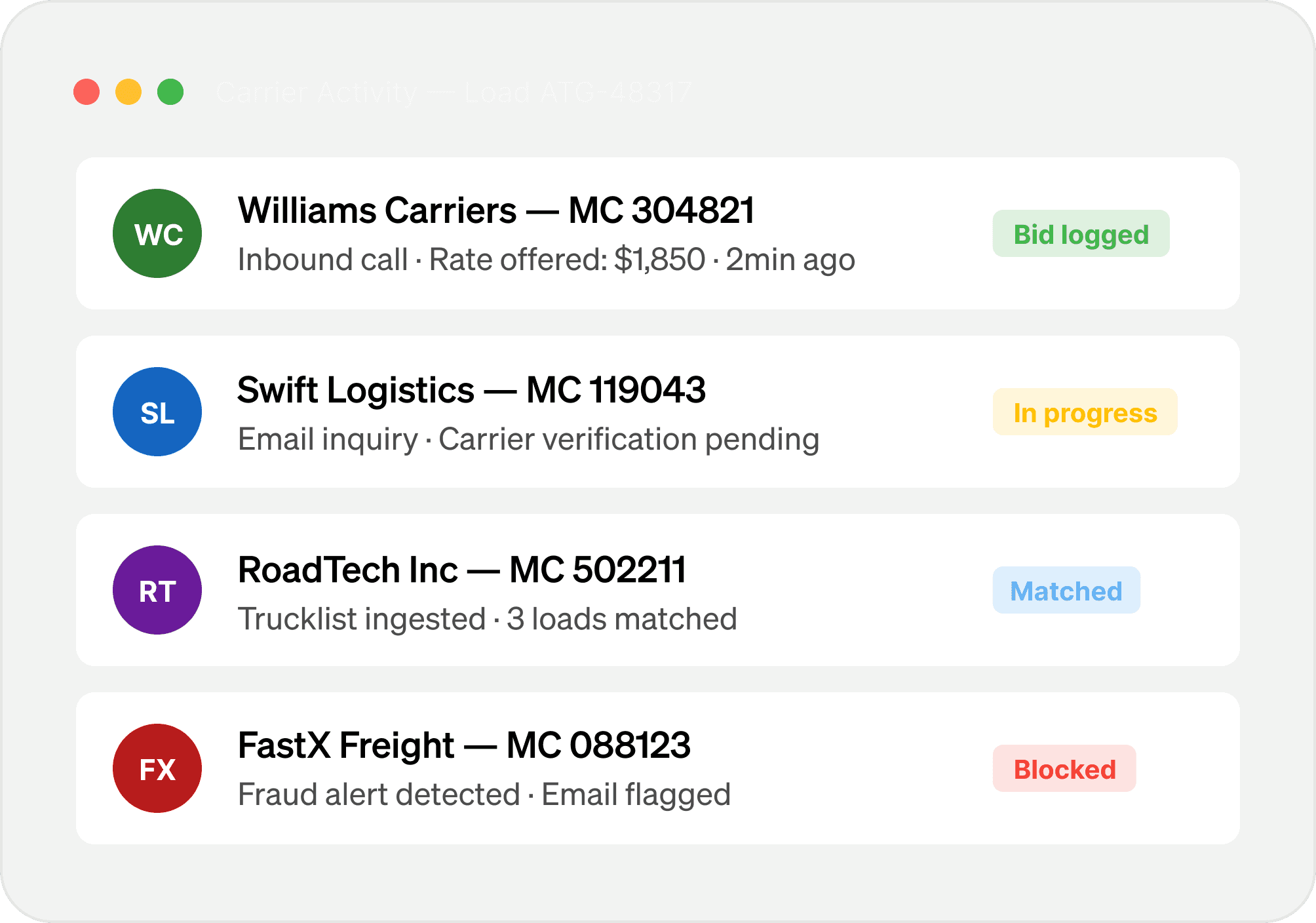 From bid to rate confirmation, Augie collects truck and driver info, gets rep approval, books the load, and sends the rate con automatically.