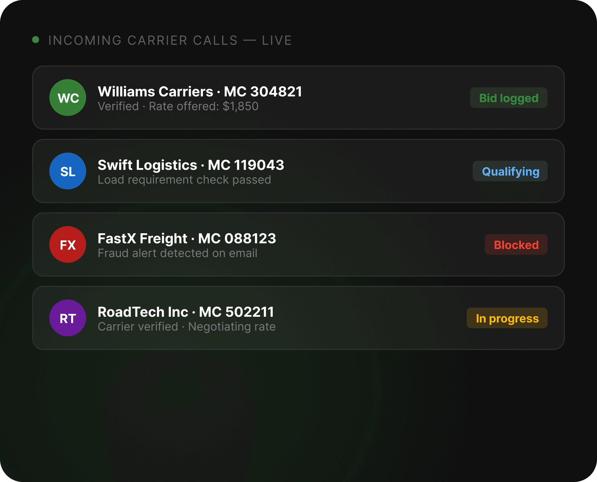 Your 24/7 carrier sales assistant, fully automated.