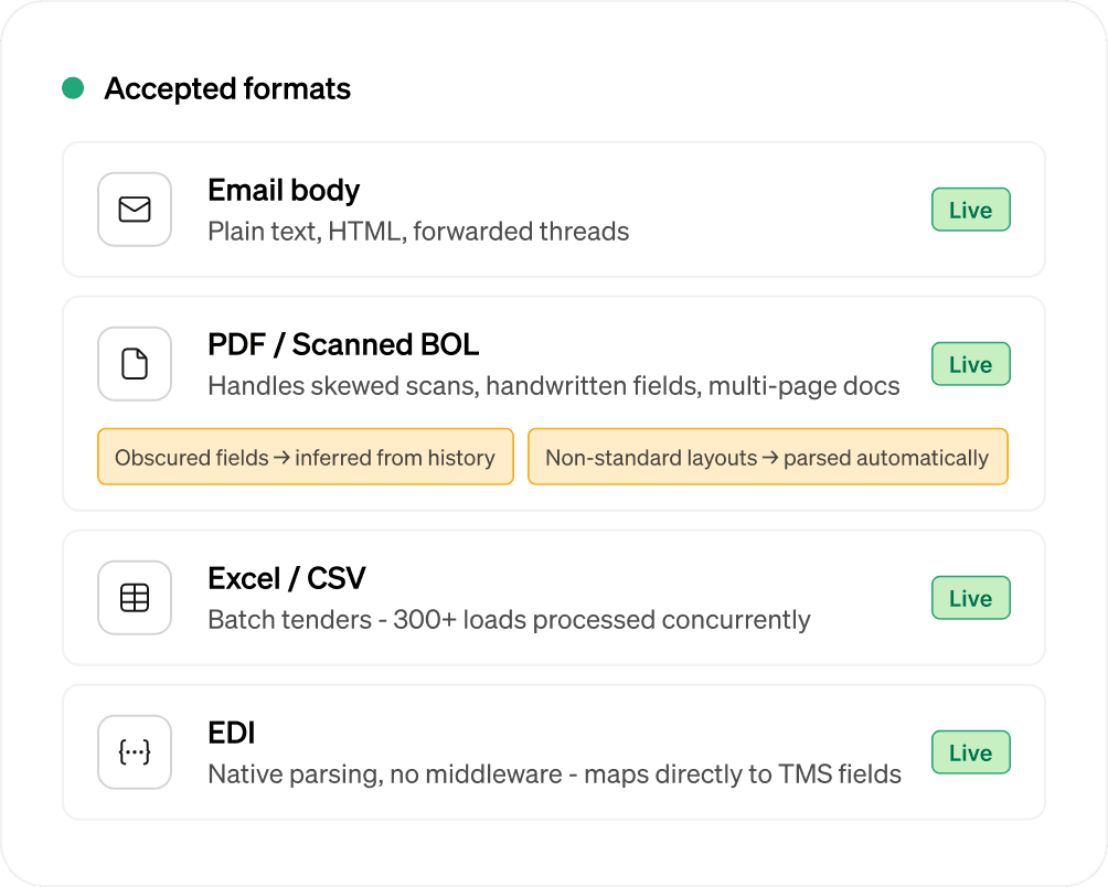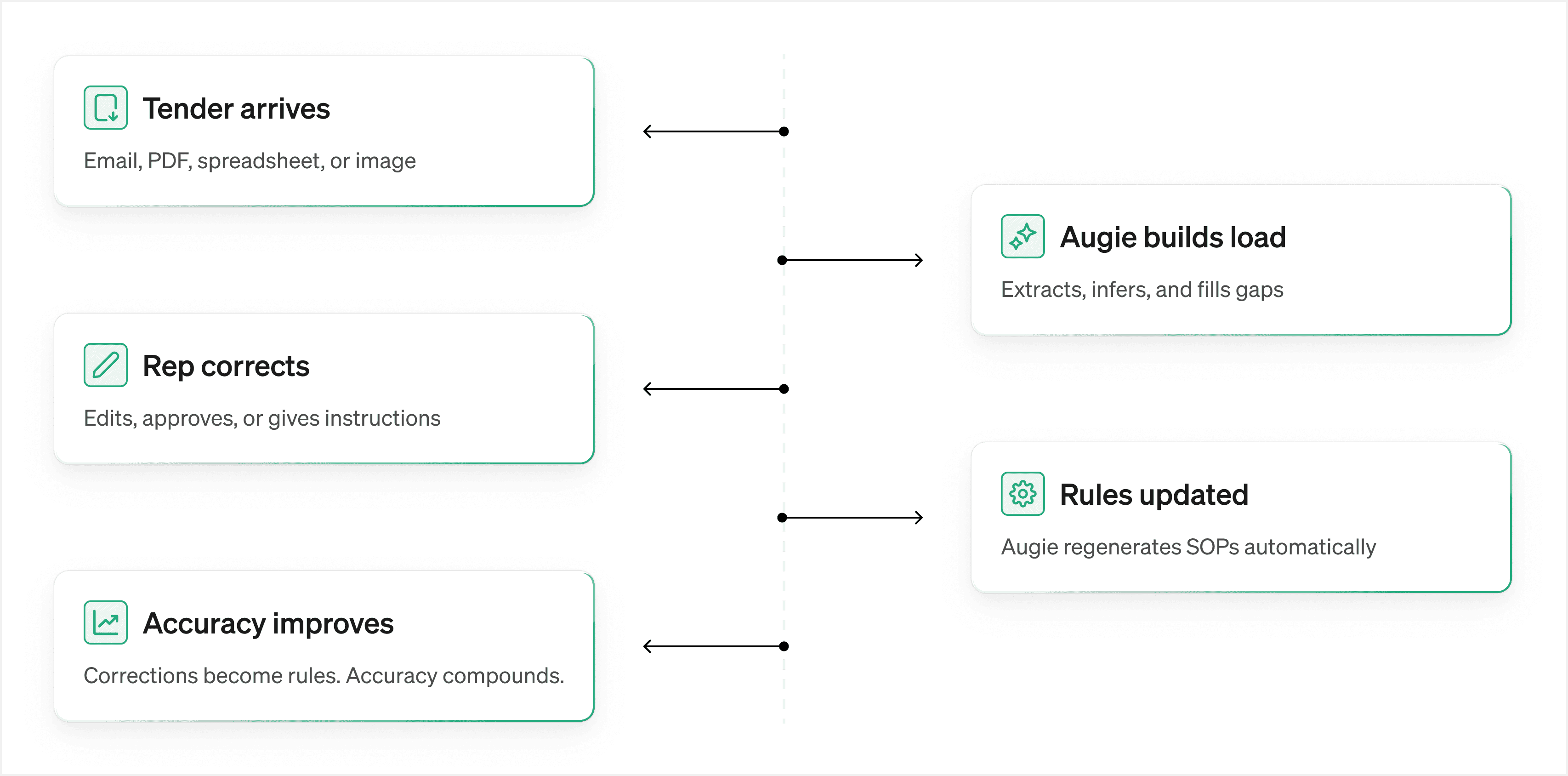 Augie reads your emails, BOLs, and shipping documents, then builds accurate loads in your TMS automatically. No templates. No RPA. No extra tools for your team.